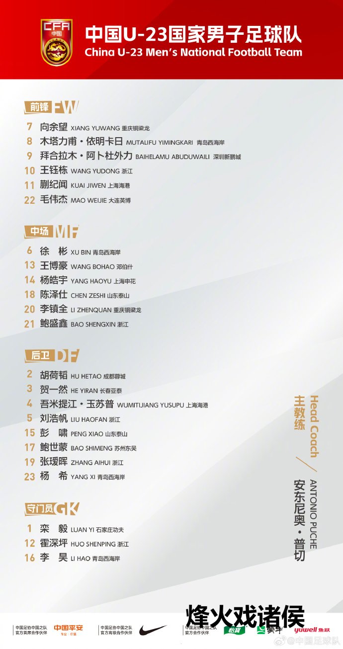 这支中国 U23 男足以此前进入过 2023 年 U20 亚洲杯(2003 年齿段球员)和 2025 年 U20 亚洲杯(2005 年齿段球员)的球员为班底,主缓助是西班经纪东说念主安东尼奥。